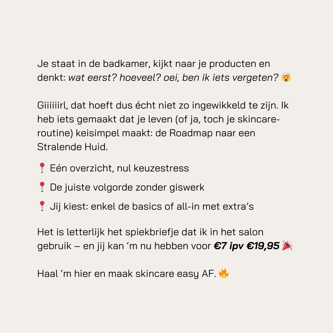 Dit E-book bevat de Roadmap, uitgebreide info over de verschillende producten én een handig invulformulier waarin jij jouw routine kan uitschrijven. Zodat je nooit meer moet twijfelen hoe jij perfecte routine eruit ziet.